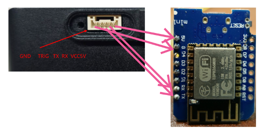 RoboBaton Mini UART uses a GH1.0 5-pin connector. Pin order (from the side near the screw hole) is: GND, TRIG, TX,RX, 5V.
